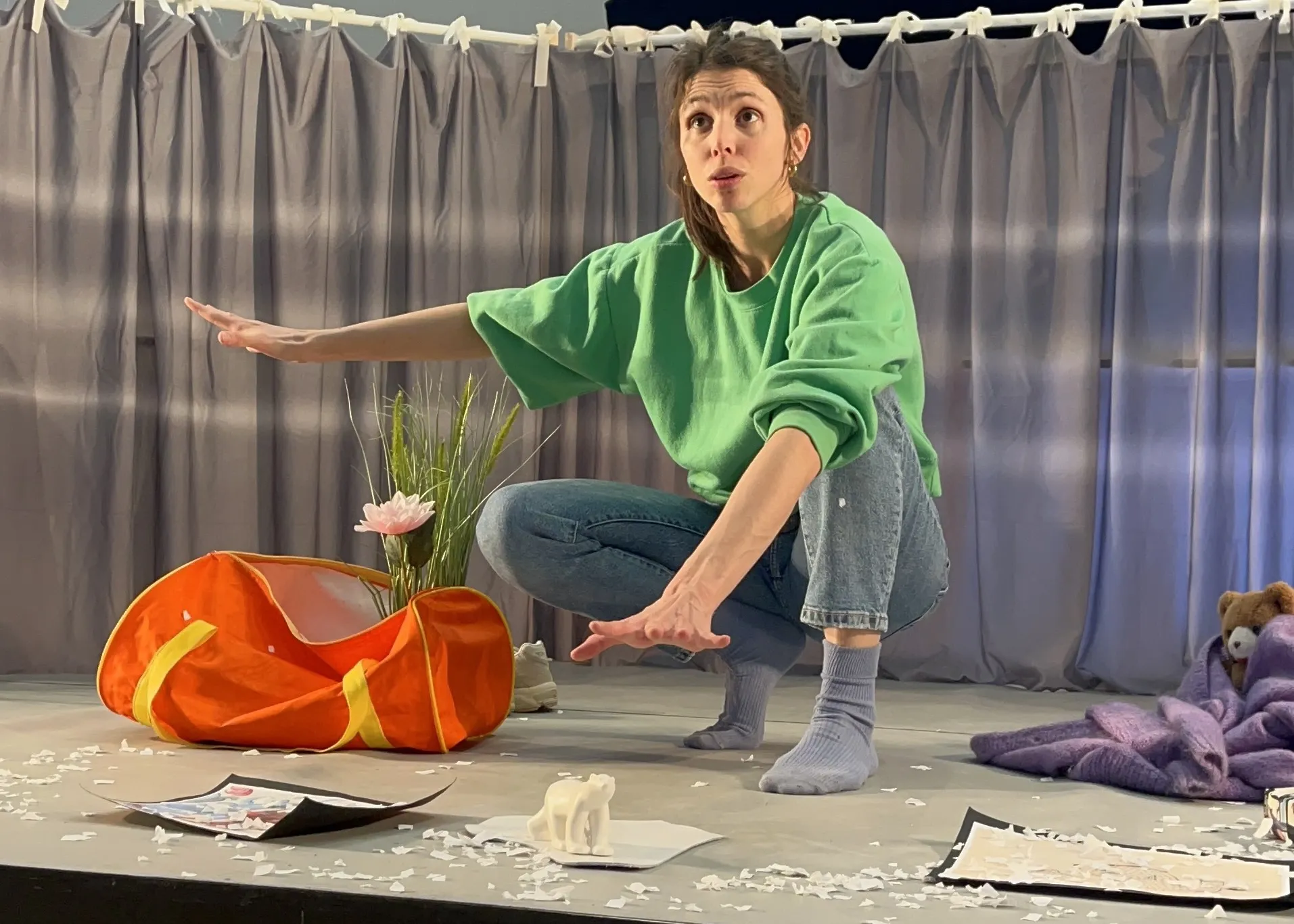 Tout à commencé avec Pompon Ours : alors qu’elle lit des histoires à sa fille, une comédienne réalise qu’elle ne connait rien au monde fascinant du célèbre mammifère. Qu’à cela ne tienne, armée de livres, d’images et de quelques surprises, elle nous entraîne sur les traces des ours bruns, grizzlis et autres ours polaires, et nous raconte la réalité étonnante de leur vie dans la nature. On découvre alors comment l’ours fait pour dormir pendant six mois, pourquoi il se frotte aux arbres, qui est le célèbre pizzly, et toutes les folles informations qu’on peut trouver… dans une simple crotte ! Une plongée poétique et scientifique au cœur du vivant, pour comprendre pourquoi le monde animal doit être protégé.